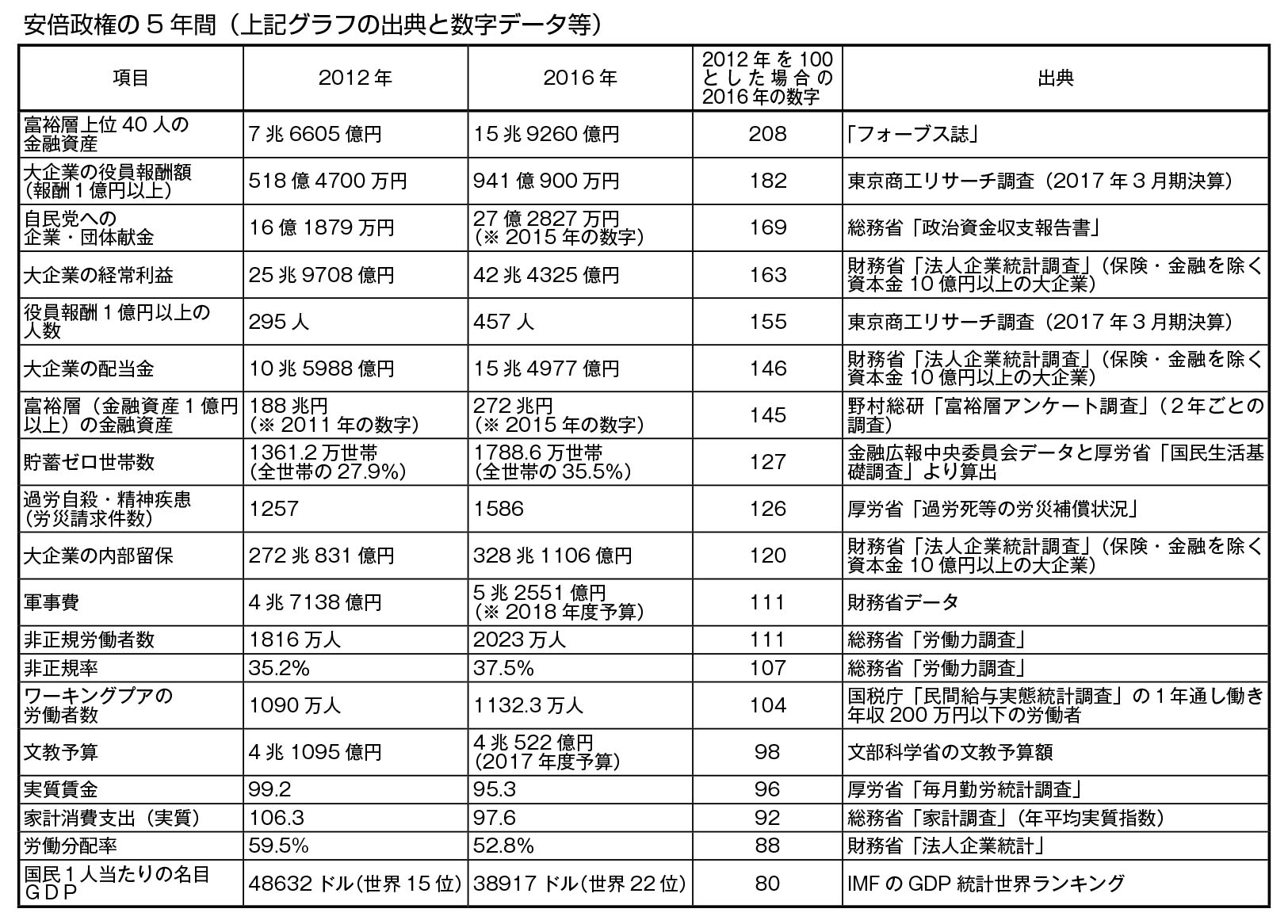 グラフ①は、安倍政権の5年間で増減が著しいデータの推移を見たものです。今の安倍政権は2012年12月26日に発足していますので、2012年の数字を100とした指数で示しました。出典等は表を参照ください。