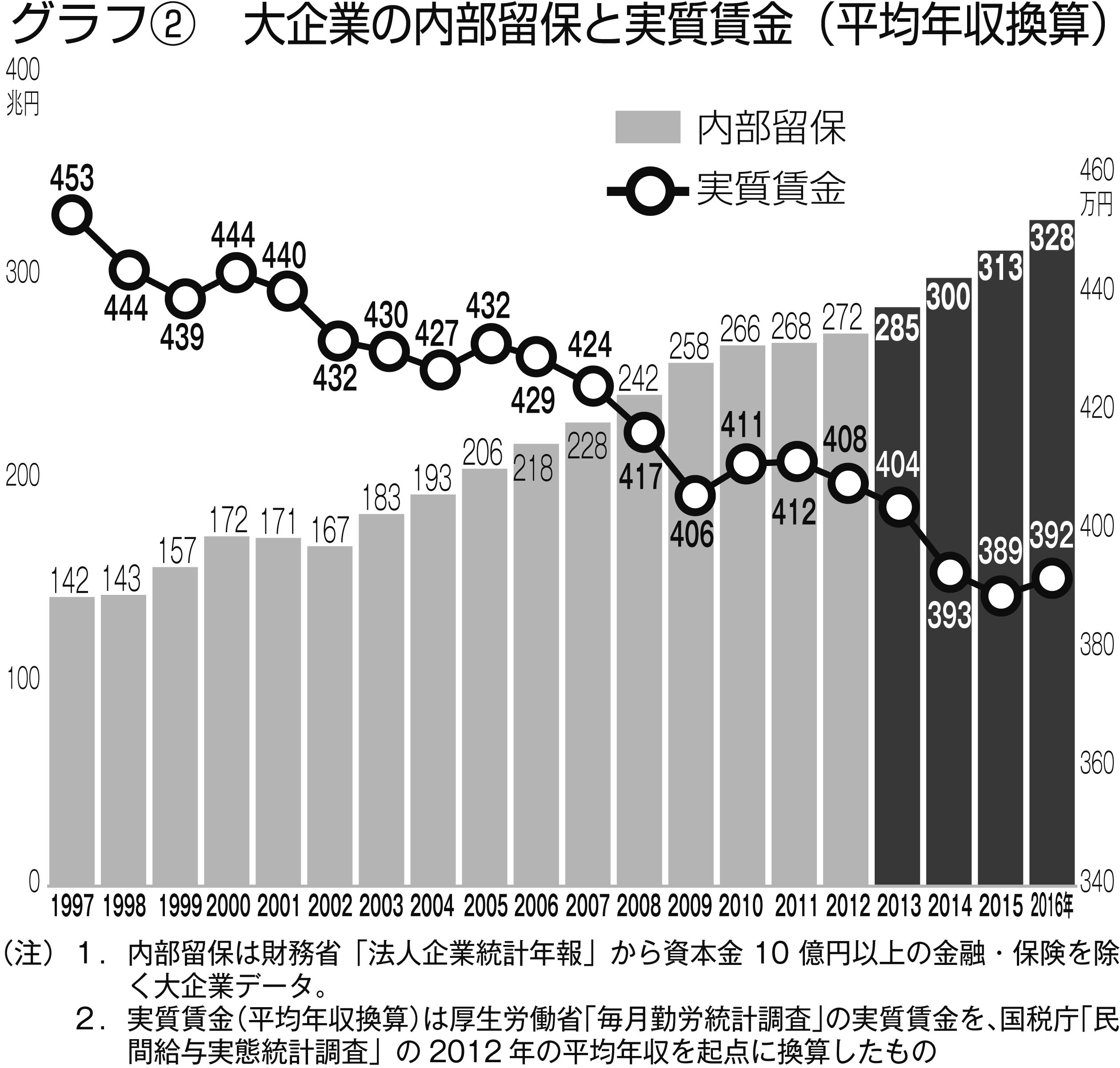 安倍政権は賃金や雇用の改善が続いているかのように宣伝しています。しかし、グラフ②にあるように実質賃金は過去最低となる一方、大企業の内部留保は過去最大となり、しかも安倍政権の5年間で56兆円も増えています。