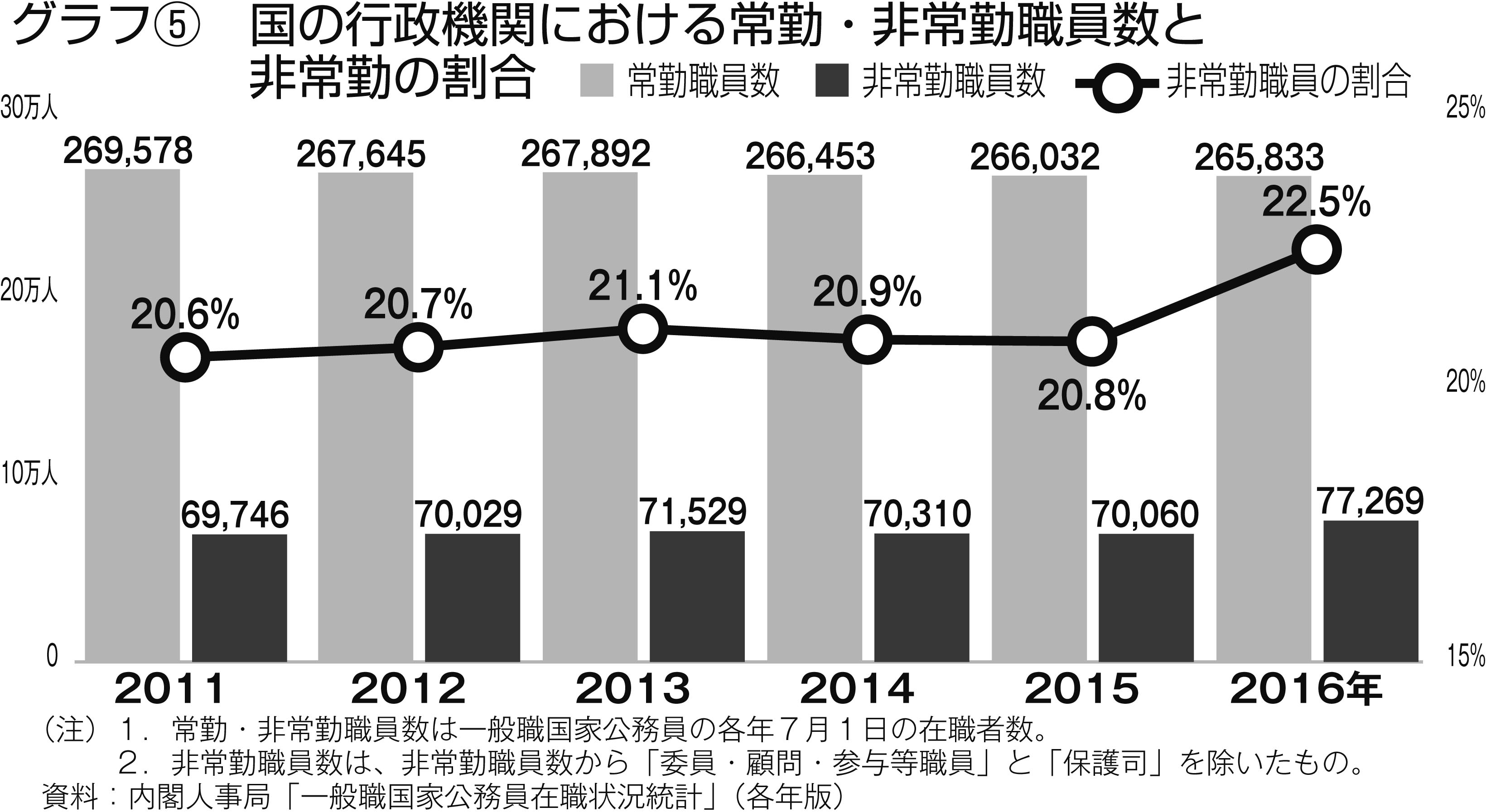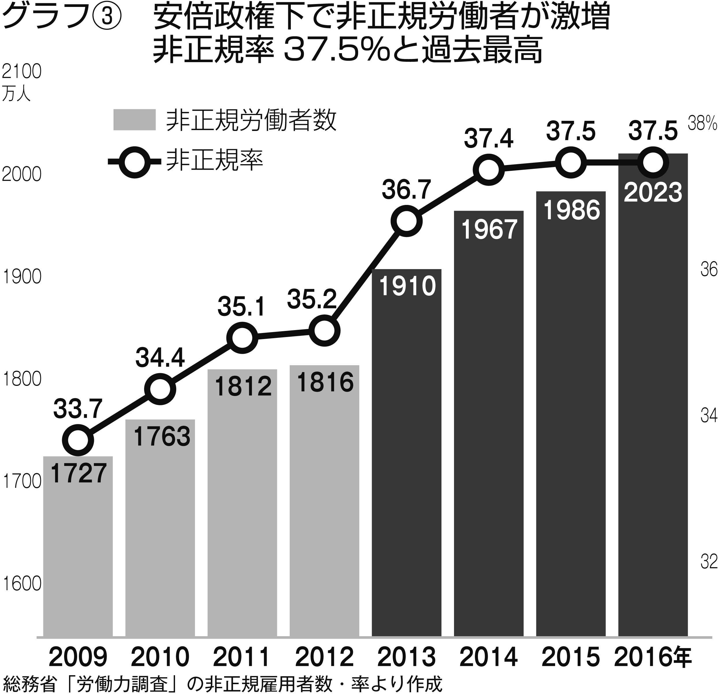 雇用の面でも、非正規労働者は207万人も増加し、非正規労働者数と非正規率ともに過去最高となっています(グラフ③)。
