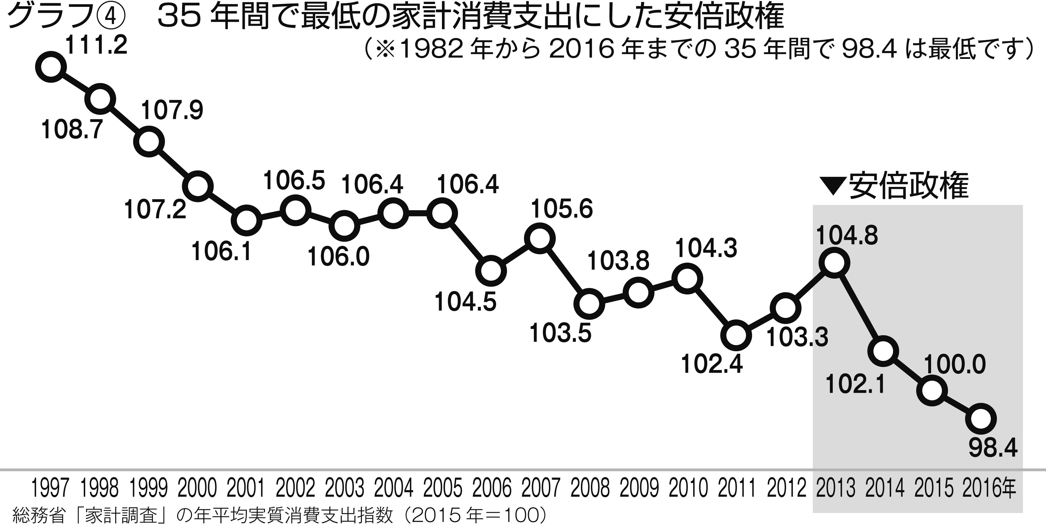 こうして非正規労働者ばかりが増え、賃金は下がるばかりですから結果として、この35年間で最低の家計消費支出になっているのです(グラフ④)。