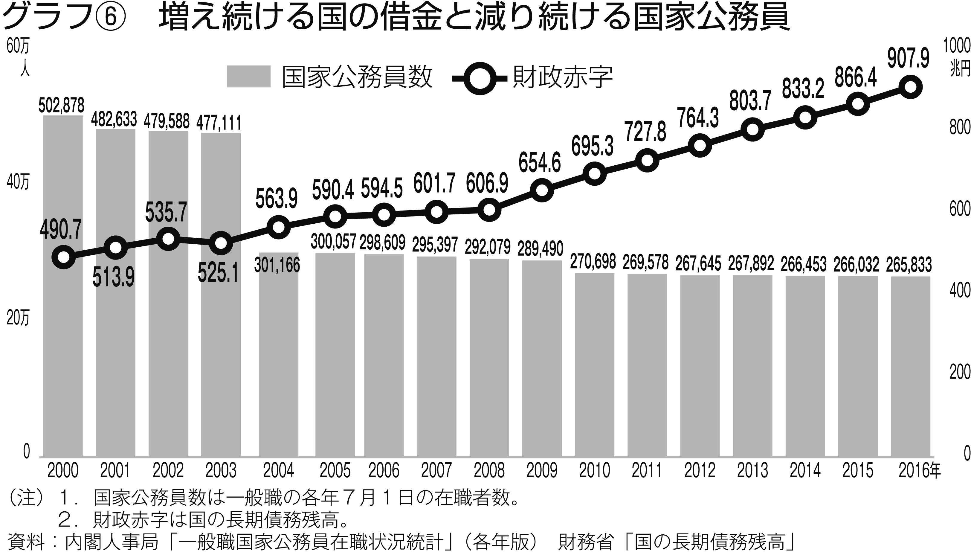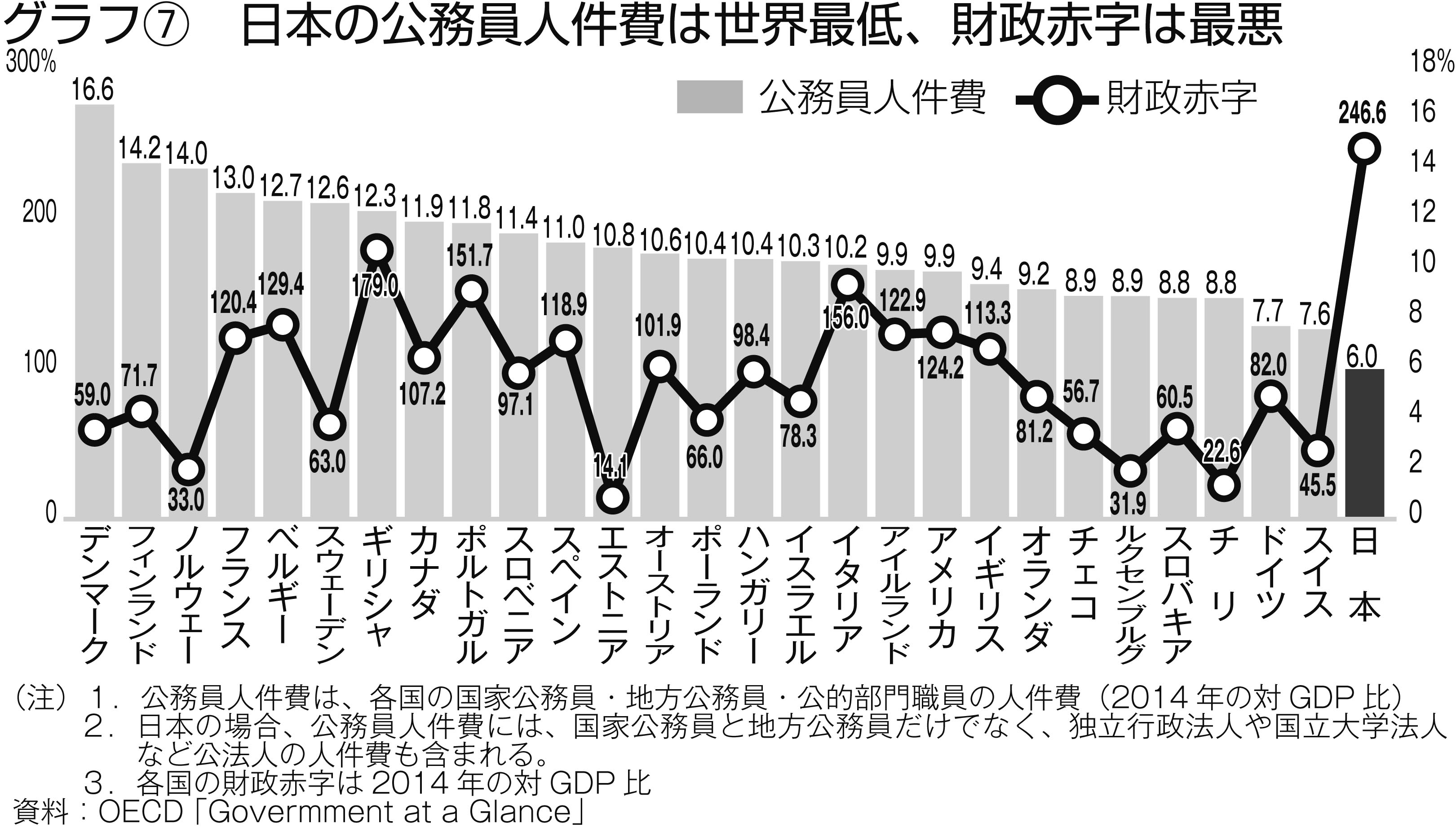 安倍政権は国家公務員の常勤職員を減らし非常勤職員を増やし(グラフ⑤)、財政赤字を拡大しました(グラフ⑥)。公務員人件費が財政赤字の原因と主張し人件費削減を公約に掲げる政党がありますが(図)、日本の公務員人件費は、11年連続でOECD最低。人件費が最も高い北欧の財政赤字の方が少ないという事実によってデタラメであることがわかります(グラフ⑦)。