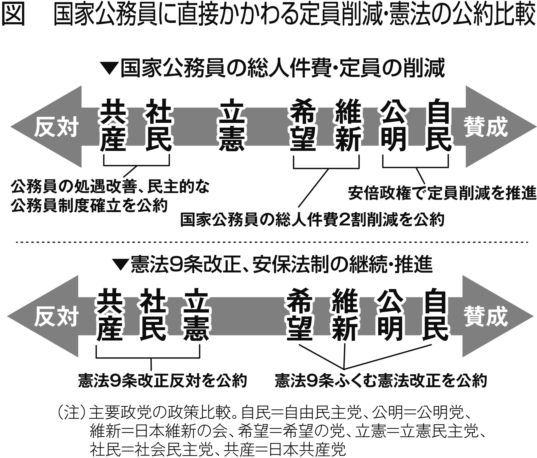 国家公務員の定員削減・人件費削減を推進する自民・公明・維新・希望の党
