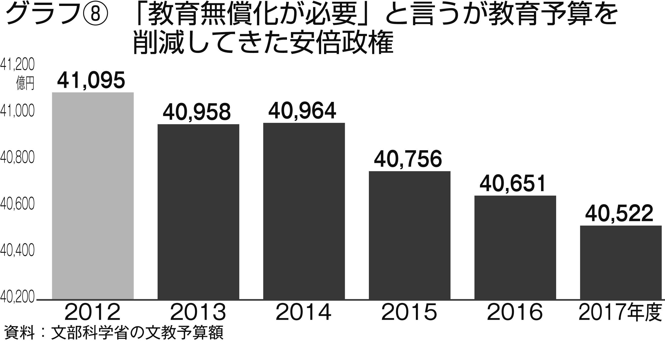 安倍首相は教育無償化のための選挙と言っていますが、教育予算減(グラフ⑧)、軍事費増で(グラフ⑨)、教育の機会均等を壊してきたのが安倍政権です。