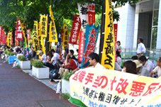 退職手当削減方針の政府決定や人事院勧告が来週にも行われる見込みの緊迫した情勢のもと、国公労連は本日8月3日、実額比較での「賃下げ」回復勧告と50才台の昇給・昇格見直し(抑制)撤回、退職手当改悪の撤回を求め、全労連公務部会が主催した昼休み人事院前要求行動、政府への個人請願と総務省前座り込み行動に結集、奮闘しました。