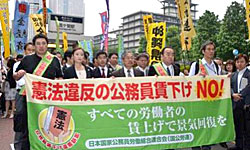 激励あいさつした全労連の大黒議長は、「全労連は国公労連の勇気ある行動を全面的に支援する。国家公務員の賃下げをテコにすべての労働者に低賃金を押しつける二重三重の攻撃を跳ね返さなければならない。社保庁職員の不当解雇を許さないたたかいとともに、賃下げも解雇も許さず、労働基本権の回復で人間の尊厳が大切にされる社会をつくるため、公務と民間の仲間の力をあわせよう」と訴えました。東京地評の伊藤議長は、「長引く不況のなか一日も早く景気回復をはかるために国と企業がやるべきことは、すべての労働者の賃上げと雇用確保で内需を拡大することだ。憲法の番人ではなく財界・大企業のための裁判所になっている最近の司法のあり方も正さなければならない。違憲訴訟勝利のため、東京地評はともに全力でたたかう」と述べました。