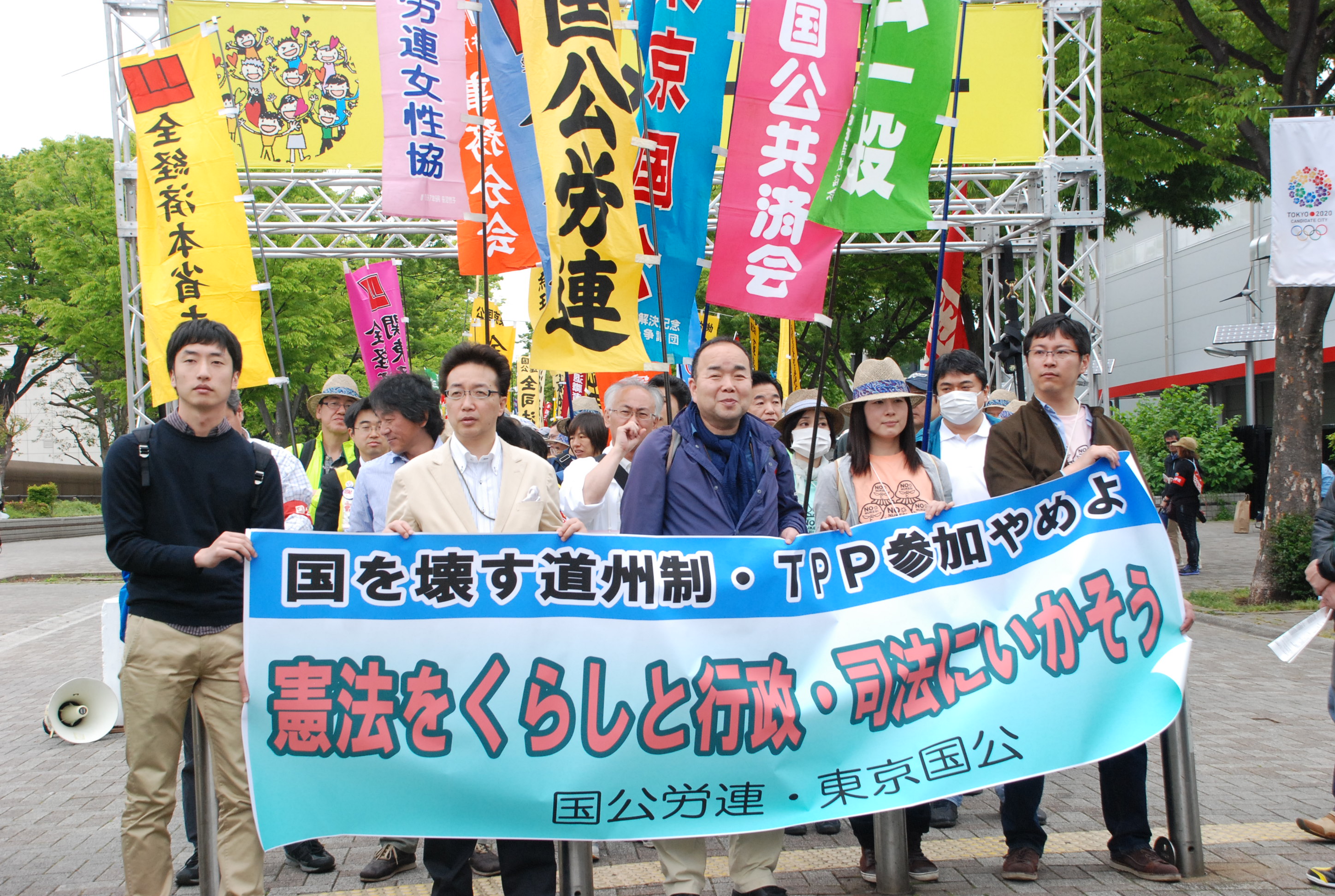 賃上げや安定した雇用の実現、消費税増税やTPP参加阻止、憲法改悪反対などをかかげて5月1日、第84回メーデーが全国322カ所で開催されました。雨あがりのなか開催された中央メーデー(東京・代々木公園)には、公務と民間の労働者など全体で21,000人(国公労連・東京国公は約800人)が参加しました。
