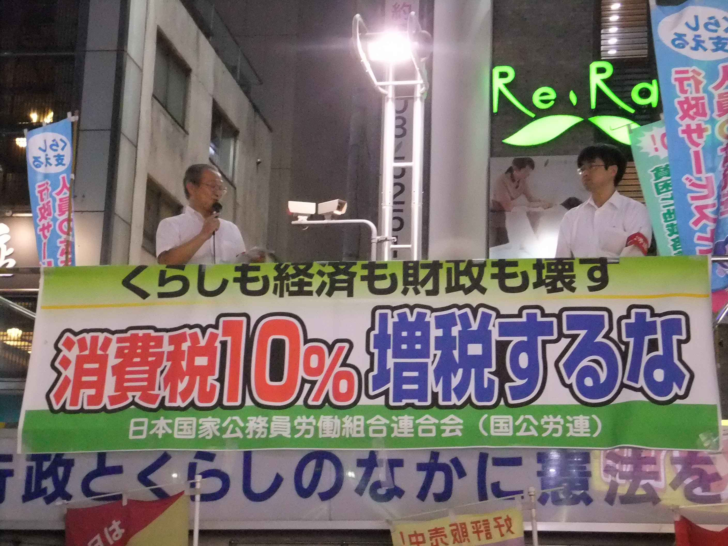 宣伝カーから訴えた国公労連の花岡中央執行委員は、「安倍政権は、来年4月からの消費税引き上げを秋の臨時国会前までに判断するとしている。FNN世論調査で8割の人が景気回復を感じていない状況で、消費税率を引き上げて本当にいいのか。格差と貧困をなくし、誰もが安心して働き暮らせる社会の実現、景気を回復するため、公務も民間もすべての労働者の賃金を引き上げよう」と述べました。