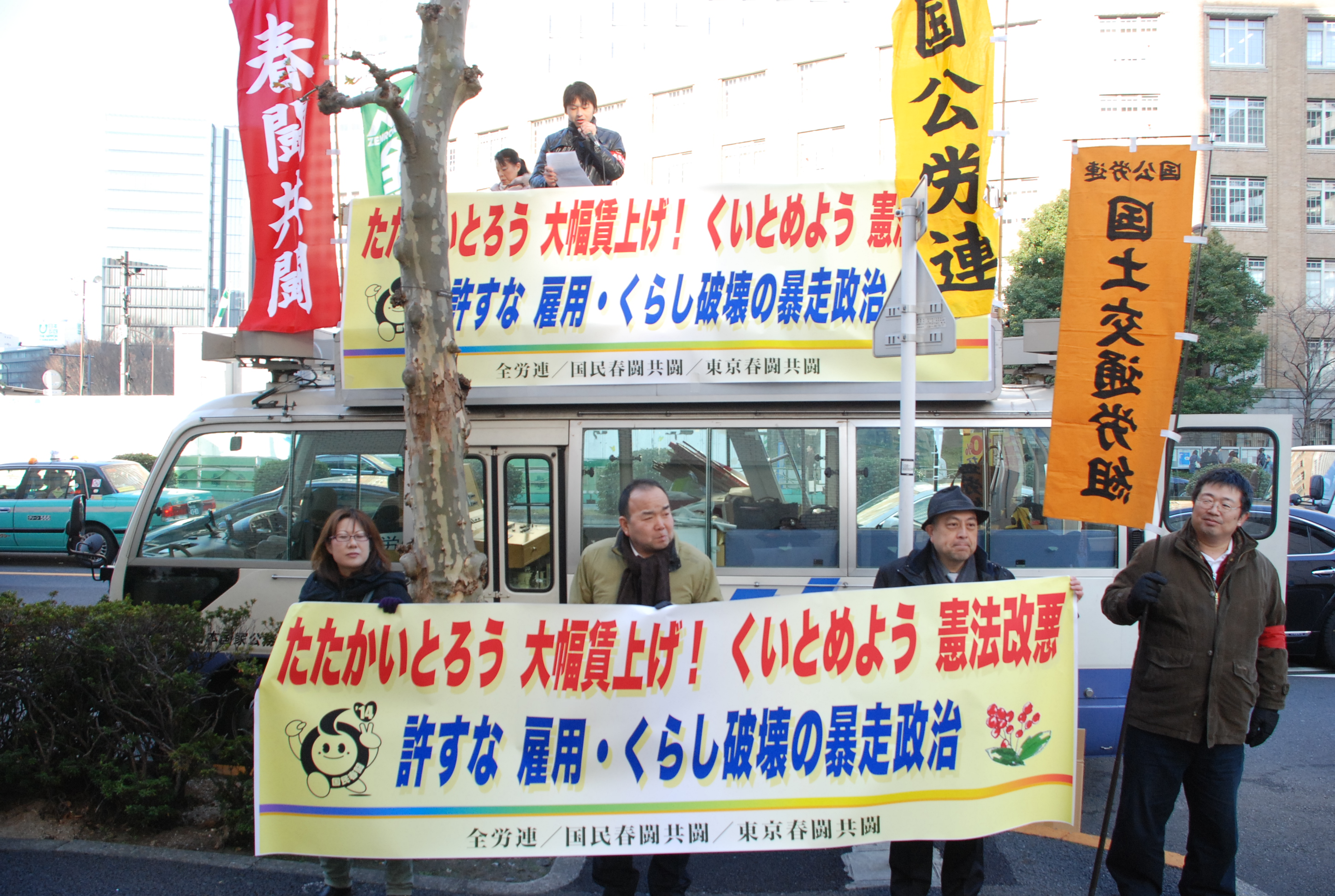 トップバッターとしてマイクを握った国公労連の宮垣委員長は、「安倍首相がすすめるアベノミクスだが国民の大多数はその恩恵を全く感じてなく、4月からの消費税増税への不安が高まっている。消費税増税で8兆円、年金削減などの社会保障の負担増と給付減で10兆円の負担増となる。デフレ不況を招いた原因は労働者の生活悪化と大企業の横暴にある。企業を規制し、労働者の賃上げと良質な雇用の確保によって不況を克服しよう」と呼びかけました。