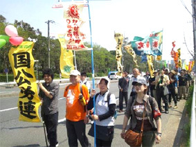 さらに沿道アピール隊も組織され、行進をしつつ沿道の人にウチワやビラを配布したのも今年の特徴です。道行く人が、歩道からウチワをふりながら挨拶を交わしてくれるなど感動ものでした。途中で設けられた休憩所では地元の労組や民主団体からの差し入れもあり、感謝しつつひととき疲れを癒しました。