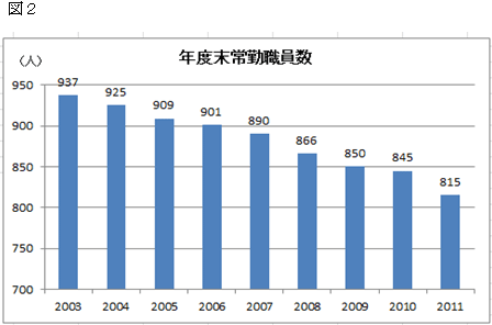 統計センターの財政のほとんどが、運営費交付金によって支えられています。また、人件費についても、行革推進法による削減もかさなって慢性的な人員不足が生じ、発足当時の2003年に比べ約120名の減となっています。(図1、図2)