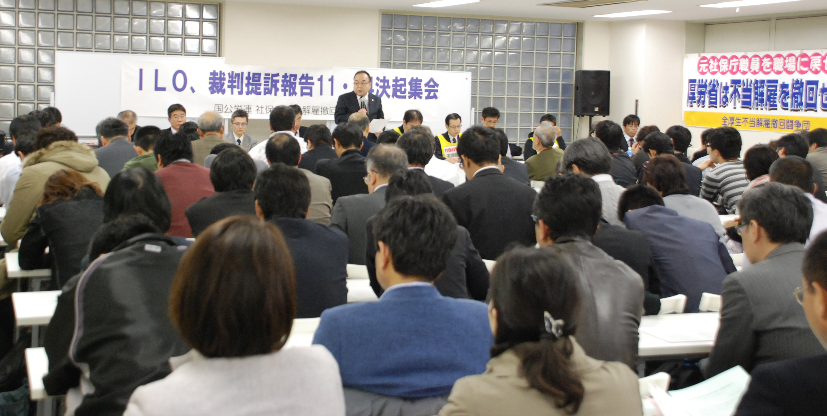 日本政府による社保庁職員の不当解雇はILO87号、98号条約違反としてILOに申し立てた全厚生闘争団(京都)の川口さんは、「11月6日にILO結社の自由委員会へ提訴した。政府が組合活動を理由にした懲戒処分を行い、処分を受けた職員の年金機構への応募を一律に認めなかったのは、組合活動を保障したILO条約に違反している。社保庁民営化と525人もの大量解雇を強行し、国民の年金権・財産権をないがしろにしてきた日本政府の責任は明白だ。公務員攻撃を跳ね返し、労働者の誇りと権利を守るために奮闘する」と報告しました。