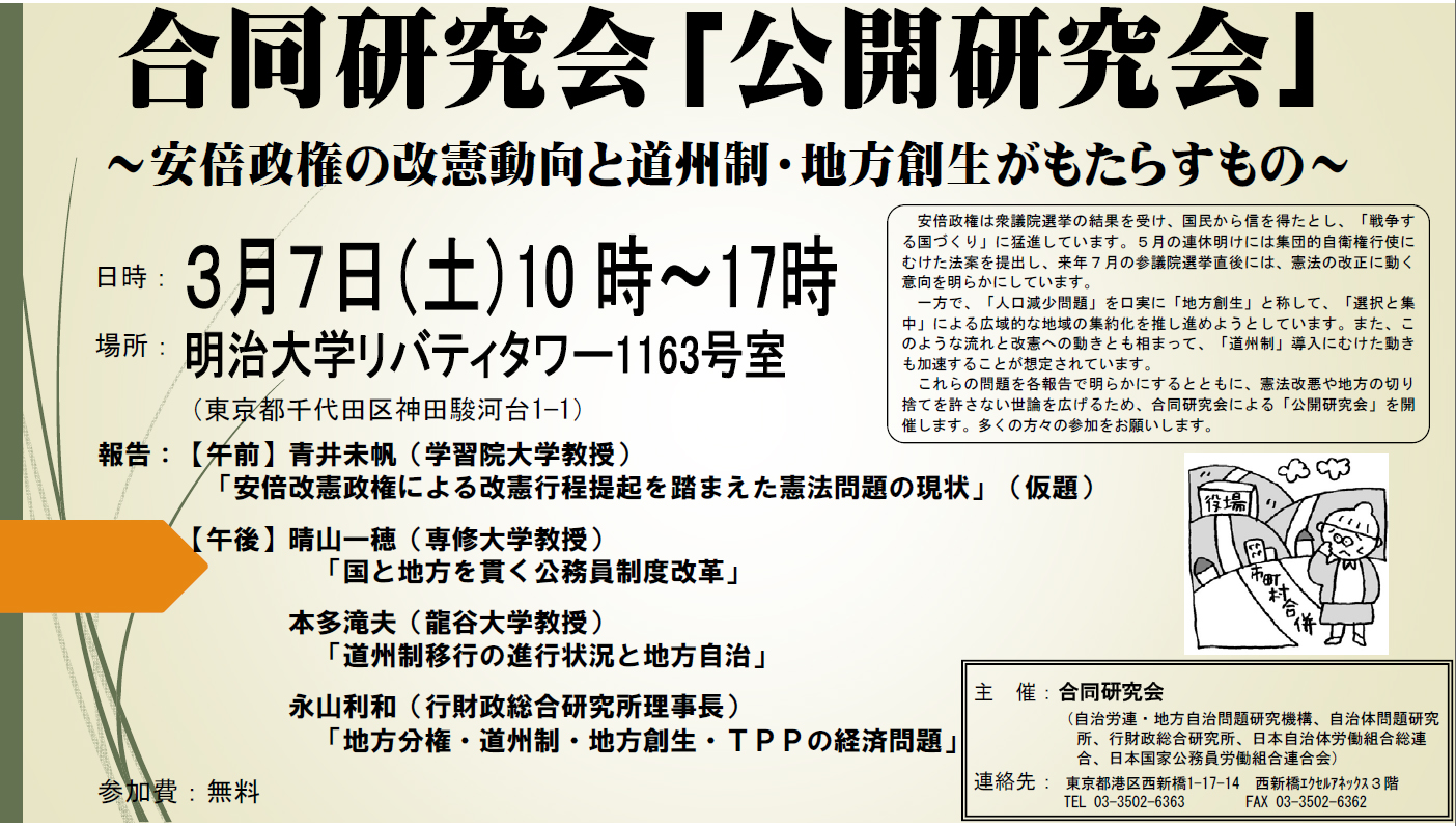 安倍政権の改憲動向と道州制・地方創生がもたらすもの【公開研究会★どなたでも参加いただけます】★3/7(土)10時~17時★明治大学リバティタワー1163号室