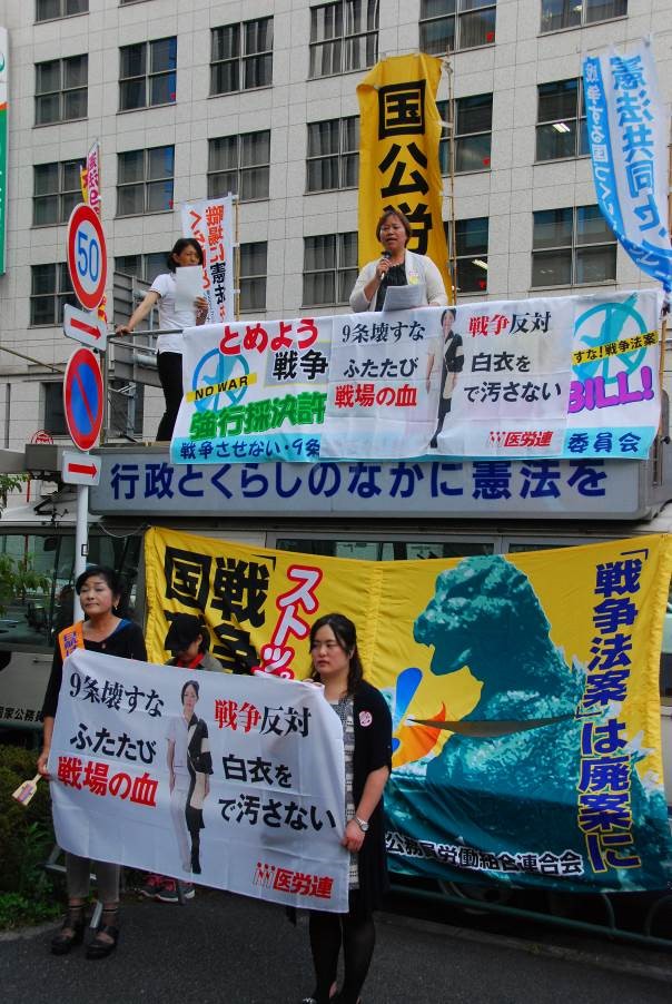 国公労連の橋本書記次長は、「戦争法案の先にある『戦争する国』で犠牲になるのは、子ども・お年寄りなど立場の弱い人や普通に生活をしている市民だ。子 どもや孫たちの未来に、『戦争する国』を残すことは絶対にできない」とのべ、東京国公の植松事務局長は、「圧倒的多数の憲法学者や歴代内閣法制局長官、元 自民党幹部が違憲と言い、国民の圧倒的多数が世論調査で違憲と表明している戦争法案を、安倍政権が強引に通そうとしている。これは国民主権そのものの否定 だ。憲法9条を守り、日本が平和のイニシアチブをとることこそ、平和を願う国民と世界の人々が望んでいることだ」と訴えました。
