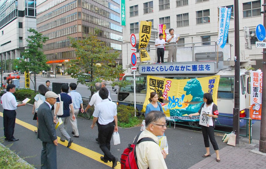 集団的自衛権を行使し、海外での武力行使を可能とする憲法違反の戦争法案(安全保障関連法案)が、衆議院の特別委員会・本会議で強行採決が繰り返される もと、国公労連は「戦争させない・9条壊すな!総がかり行動実行委員会」に結集して、7月から8月にかけて毎週火曜日夕方、西新橋1丁目交差点にて宣伝行 動にとりくんできました。
