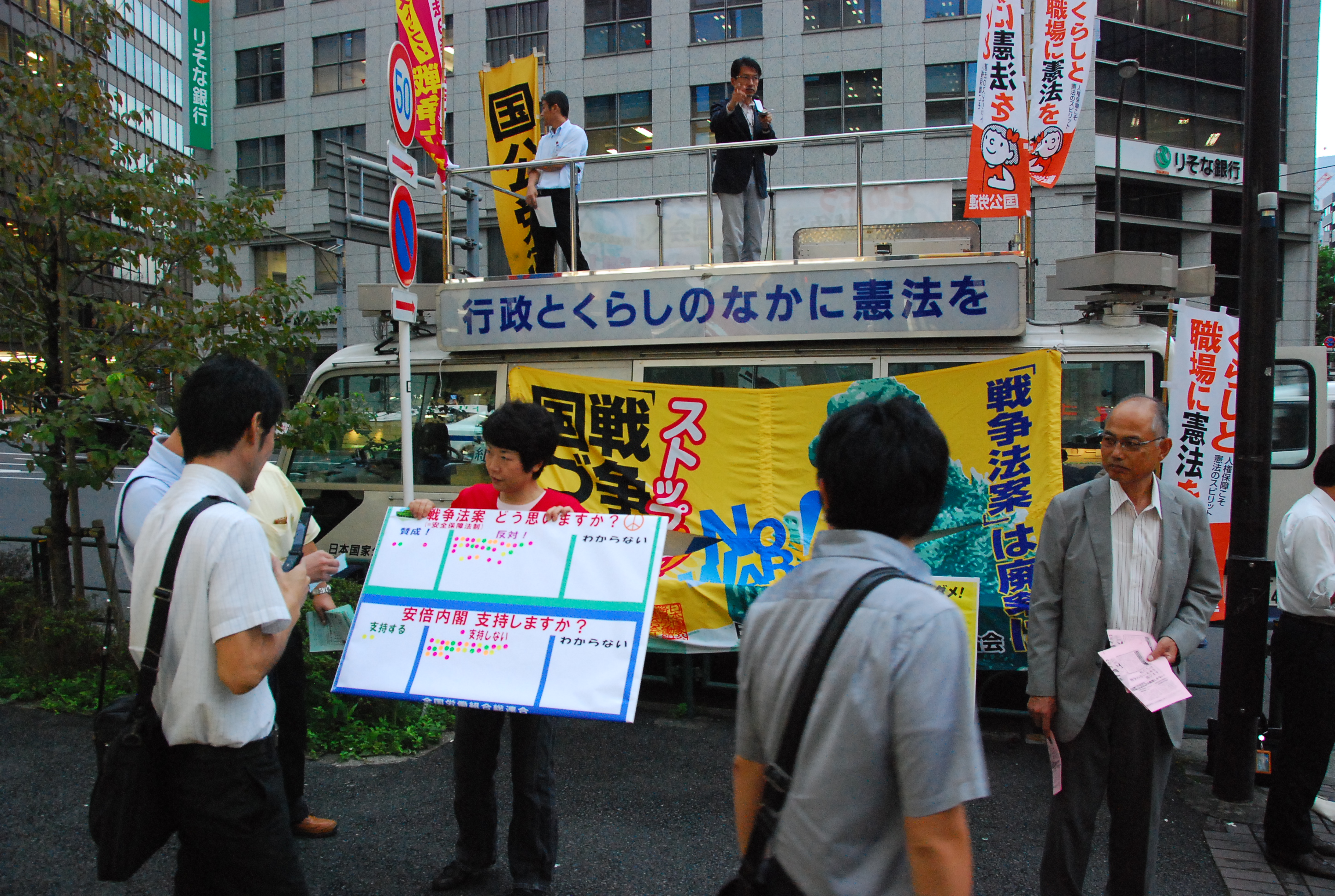 宣伝カーの上でマイクを握った全労働の河村副委員長(写真)は、「戦争法案は審議すればするほど、問題点が次々と出てくる。9 日の日比谷野音集会・デモ、10 日・11日の国会正門前大行動、14日から連日の座り込み行動など、これからも連日のたたかいで安倍内閣に廃案をせまる。私たちと一緒に行動に参加して、 反対の声をあげよう。行動に参加できなくとも、平和を願う思いを署名に託してほしい」と呼びかけました。
