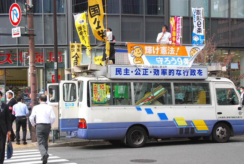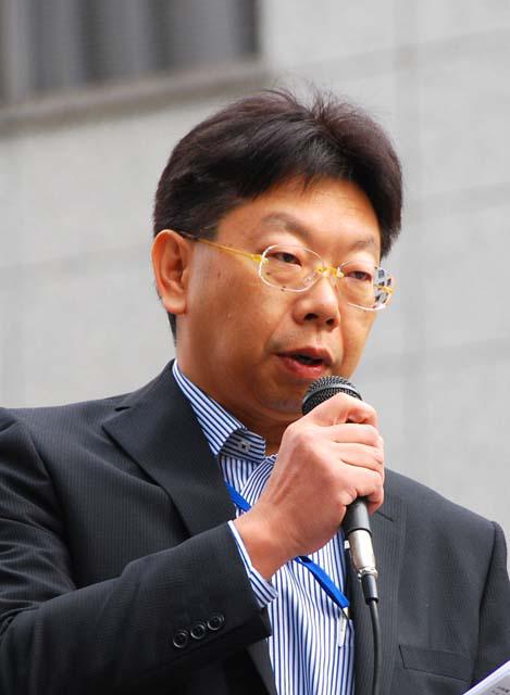 宣伝行動でマイ クを握った国公労連の岡部委員長は、「国家公務員の数は現在58万6千人。独立行政法人や大学法人への移行もあるが、定員削減が続く中で、2000年の 113万人から半減した。戦争法の成立によって、日本はアメリカの起こす戦争に参加することになる。戦争法は憲法9条違反であり、平和主義・民主主義・立 憲主義をくつがえすもの。国際紛争や貧困・差別をなくすために、憲法9条をもつ日本がすべきことは従来にも増して外交努力を尽くすことである」と強調し、 「国は、その役割を外交・防衛に特化し、福祉・教育・医療などを自治体に押し付けようとしている。市町村合併によって過疎化が進行し地域経済も疲弊してい る。安倍首相は、『一億総活躍』などと言うが、そうであるなら、正規労働者を増やし、公務員の定員削減もやめるべきだ。国民の安全・安心を守るのが国家公 務員の役割であり、行財政・司法の体制拡充を求めて奮闘する」と訴えました。