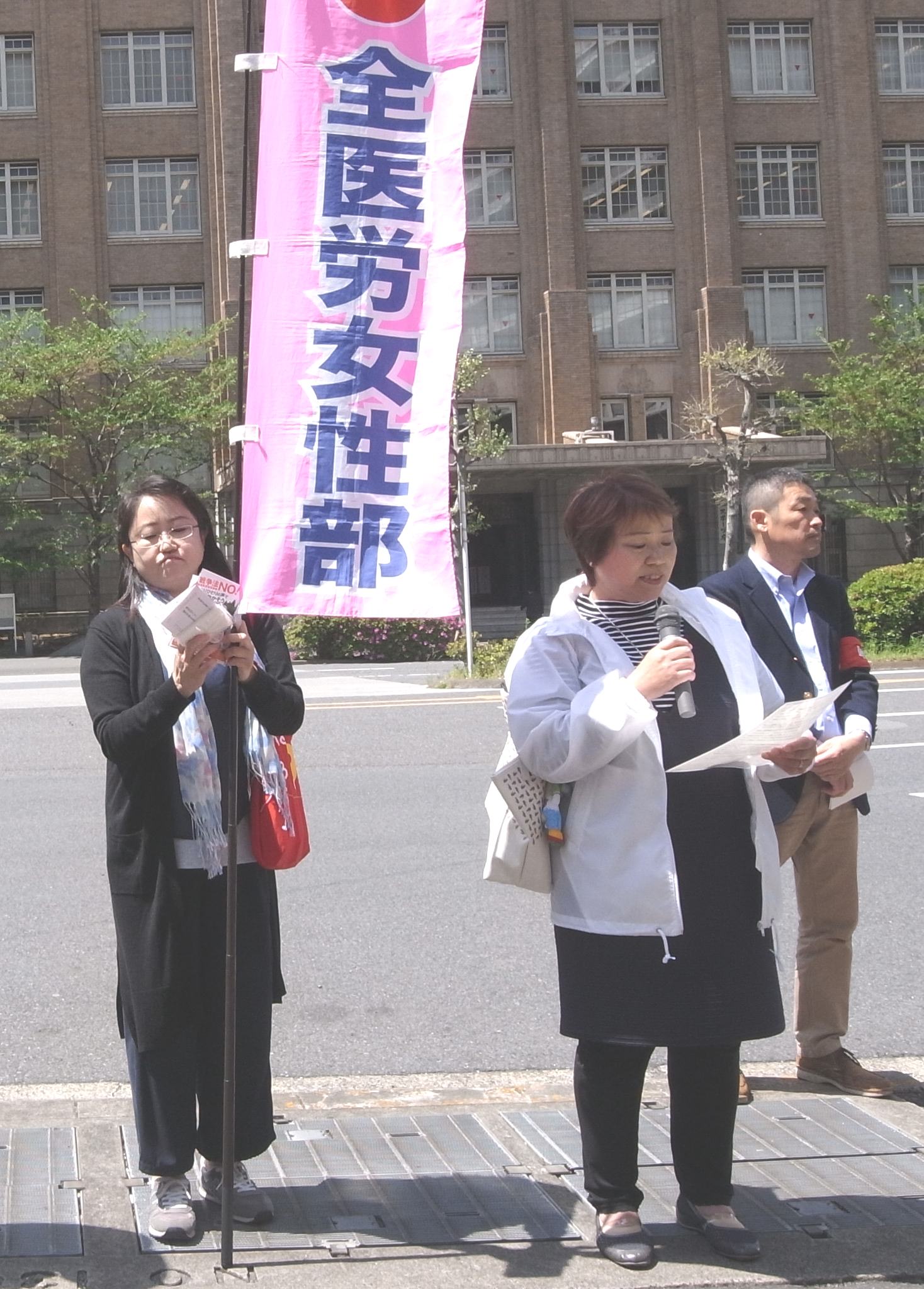全医労の中丸副委員長は、医療労働者の立場から、「70年前の戦争で多くの女性が従軍看護婦と して招集され、戦地におもむいた。戦地での看護は、重傷の負傷兵に青酸カリの注射を命じられ、従うしかなく、看護師でありながら見殺しにしたという悲しい 過酷な経験をした。戦争には、絶対に反対する。戦後、医療労働者は『ふたたび白衣を戦場の血で汚さない』と決意して運動してきた。一人でも多くの人が『憲 法9条を守ろう、戦争法を廃止しろ』と声を上げ続けよう」と訴えました。