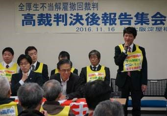判決の内容を京都弁護団事務局長の渡辺弁護士(写真左)が、「総論的には、地裁判決より前進した判決となった。分限免職回避努力義務を負う主体について、社保庁長官と厚生労働大臣だけでなく、政府についても間接的ではあるが回避努力義務を負う、という認定をした。このように、義務を負う主体の範囲が地裁よりも明確に広がっている」としたうえで、敗訴に至った理由として2点挙げられるとし、「① 回避義務を負う時間軸を狭くしている。我々は、どんなに遅くても、機構法が成立した平成19年7月以降は義務を負うと主張してきた。判決は、基本計画が閣議決定された平成20年7月29日までは具体的に動きようがないので、回避義務を負うのはこの日以降である、と判断した。しかし、この日以降はすでに平成21年度新規採用の内定を出した後であり、事実上回避努力として出来ることは少ない。また、② 判決は、回避努力義務の不履行について立証責任を負うのは原告である、とした。行政法学的には、行政処分の適法性の証明責任は国にあるとされている。理解不能な判決で、十分な上告理由になるもの」と報告し、上告審で逆転したいとの意気込みを語りました。