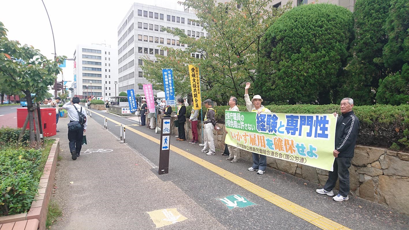 10月21日、社保庁不当回顧撤回闘争愛媛事案の第1回控訴審が高松高裁で開かれました。弁論に前には、高松高裁前で原告と愛媛支援共闘会議のみなさんが宣伝行動を行いました。