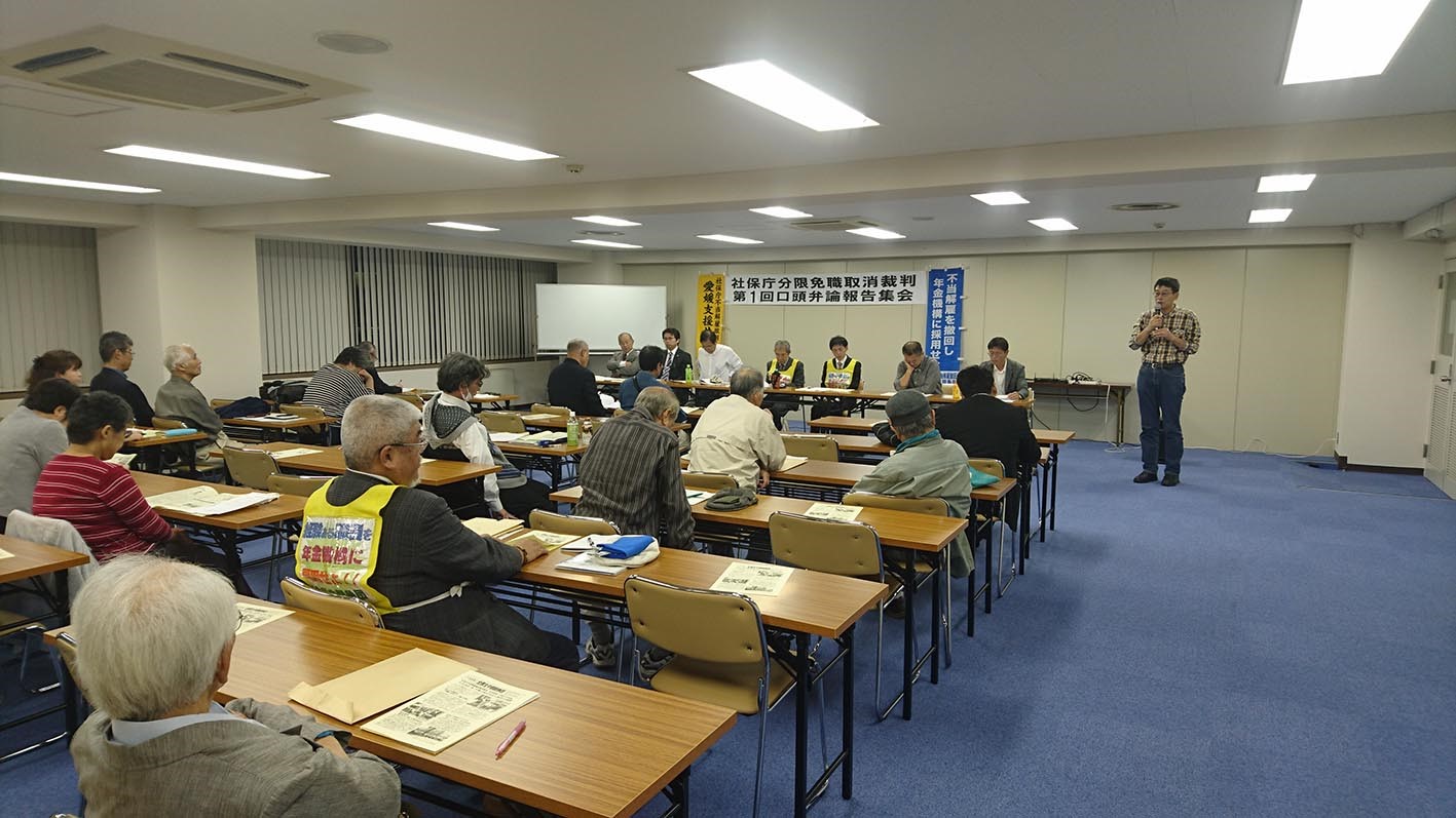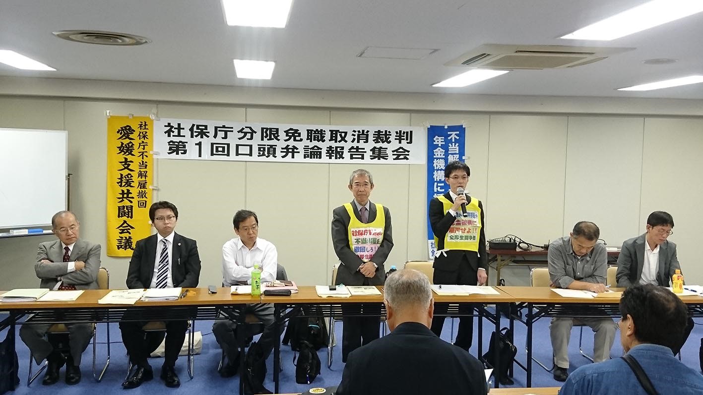 第1回控訴審(生島弘康裁判長)は大法廷で開かれ、約60人が傍聴席から見守るなかで始まりました。原告側より国に対して第1準備書面と求釈明申立書を提出し、原告の児島さんが意見陳述を行いました。意見陳述で児島さんは、在職中に専門的な知識を持って業務にあたっていたこと。「消えた年金問題」では事務所の責任者として休日や夜間を問わず解決に奮闘していたことを述べました。また、高松地裁判決は厚生労働大臣の分限回避努力を認めておきながら、法的義務を履行しなかったことに対して誤った判断を行っていると述べ、裁判長に公正な判決を求めました。