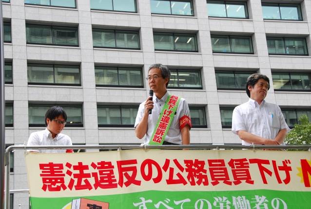 東日本大震災で母親と家を失った全労働の松木長男さんは、「震災から5年6カ月が過ぎたが、福島はじめ現在も復興には程遠い。にもかかわらず、被災地で働く国家公務員を考慮することもなく、国が大幅な賃下げを強行したことは、多くの国家公務員の仕事に対する誇りをないがしろにするものだ。労働基本権を守る唯一の手段である人事院勧告すら無視しての大幅賃下げは絶対許すことはできない。高裁は、公務労働者の働くルールについて公正な判断をせよ」と迫りました。