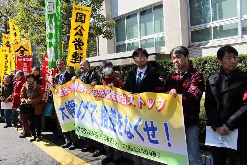 引き続いて、国公労連から赤松国土交通労組副委員長(写真右)、自治労連から山本滋賀県職副委員長、全教から有馬岡山高教組書記次長が決意表明を行い、最後は、全員で人事院に向かって、シュプレヒコールを行いました。