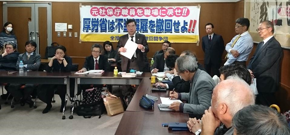 弁論終了後、弁護士会館の会議室で報告集会が行なわれました。弁護団の小部弁護士は「盛永証人は、昭和40年から社保庁の分限免職まで一度も出血整理がなされなかった歴史的事実と、それがどういう理由と経過によるものだったのかということについて、非常に迫力ある証言を行った。このような政府の(出血整理をしないという)方針が国会議事録や付帯決議という客観的事実によって裏付けられた以上、裁判所も考慮せざるを得ない」との認識を示しました。