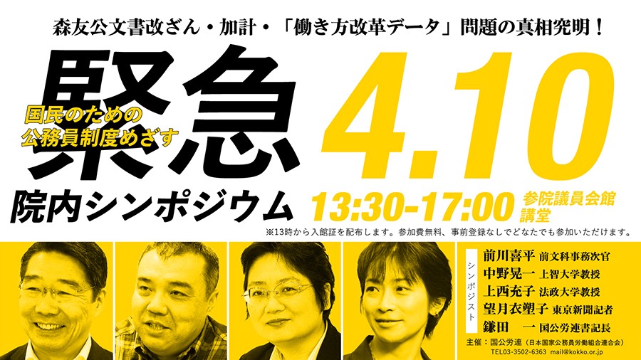 国公労連は、国家公務員を組織する労働組合として、国の行政現場から森友公文書改ざん・加計・「働き方改革データ」問題の徹底解明を求めるとともに、行政の民主化、公務の公正・中立性の確保など国民本位の公務員制度の確立をめざして、下記の通り緊急シンポジウムを開催します。