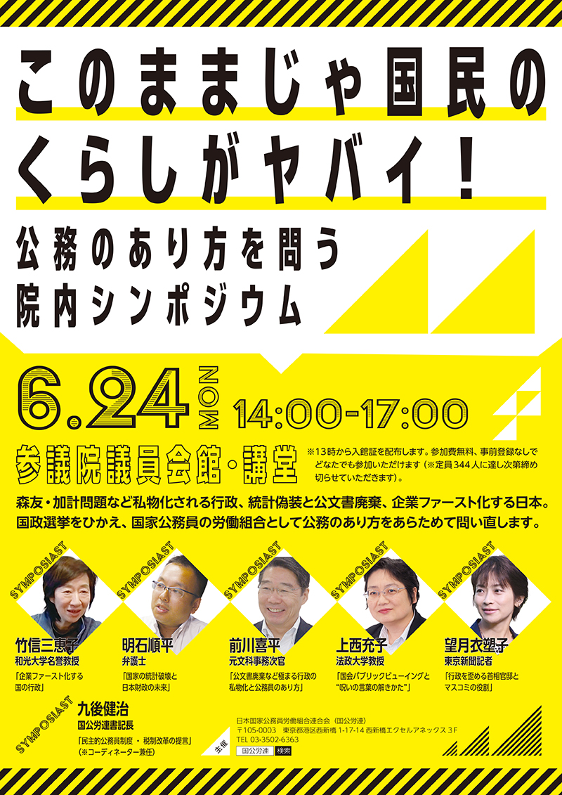 このままじゃ国民のくらしがヤバイ!公務のあり方を問う院内シンポジウムの動画を視聴ください【2019.6.24 シンポジストは竹信三恵子、明石順平、前川喜平、上西充子の各氏】