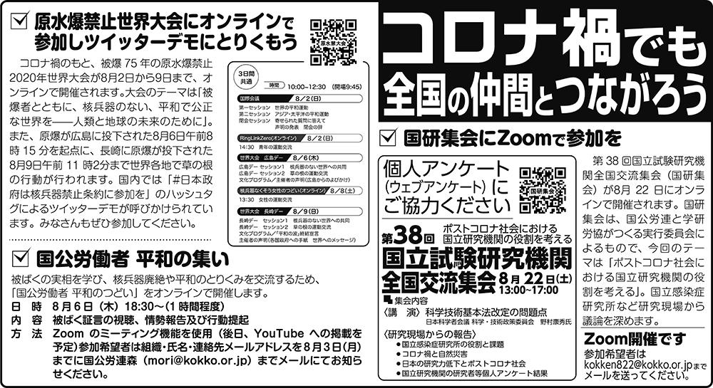 今年は新型コロナウイルス感染症の影響で夏季闘争の日程もイレギュラーな形となっています。いま、全労連公務部会が提起した「公務・公共サービス、教育の拡充を求める署名」(政府あて)、「公務労働者の賃金・労働条件の改善を求める署名」(人事院あて)を職場の声として積み上げ、追及を強めることが重要です。署名は9月3日に実施する全労連公務部会独自行動で提出します。今夏も様々な課題が山積していますが、組合員の切実な要求の実現にむけて、職場と地域からのいっそうの奮闘を呼びかけます。