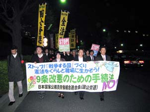 与党単独で「国民投票法案」の強行採決を狙う緊迫した4月12日、8団体(全労連、春闘共闘、労働法制中央連絡会、共同センターなど)は法案阻止を訴え、国会前で座り込みました。国公労連は同日、公務労組連絡会に結集して終日行動(全体で1300人参加)を展開。国公独自で、改憲阻止を国民に訴えた署名宣伝(有楽町・新橋)なども実施しました。