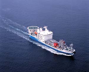 海上を航行する大型浚渫兼油回収船(清龍丸)
