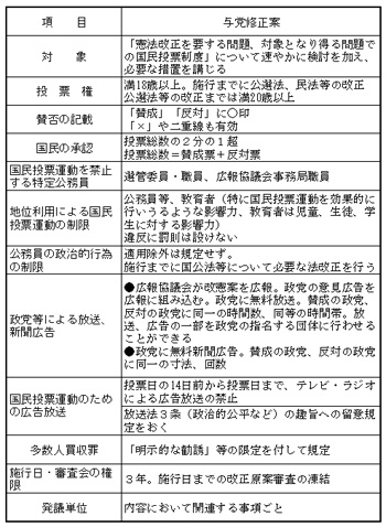 | (2) | 改憲へのハードルが低く設定。最低投票率を定めず、有効投票の過半数の賛成で改憲を成立させるため、ごく少数の賛成で改憲可能。 |