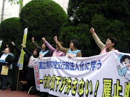 公務員制度改革は、「今後の行政改革の方針」(04年12月24日閣議決定)で、過去の経過をふまえて「関係者間の調整を更に進め、改めて改革関連法案の提出を検討する」とし、安倍首相自身、労働基本権のあり方を含めた「パッケージでの改革」を明言していたものである。にもかかわらず、当事者である私たちとの十分な協議を行わず、また何らの「調整」も「合意」も図られていない中で、一方的に関連法案を閣議決定したことは重大な約束違反であり、満身の怒りを込めて強く抗議するものである。