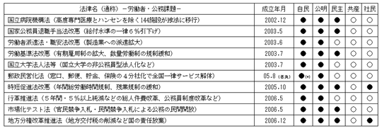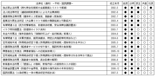 重要法案への各党の態度 02年5月以降(●賛成、○反対)