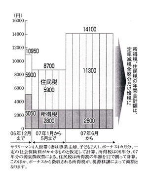 その理由は、(1)今年から所得税・住民税の定率減税が全廃させたことによる影響(国民全体で約1兆7000億円増税)、(2)国から地方への税源移譲(約3兆円)で、今年から所得税(国税)の一部が住民税(地方税)に移るからです。