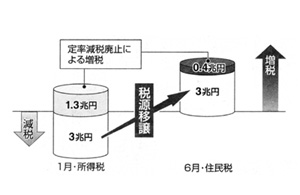 所得税は今年1月に、定率減税全廃で年1兆3000億円増税になりましたが、税源移譲によって所得税が年3兆円減りました。つまり、今年1月から5月は、所得税定率減税全廃による増税よりも税源移譲による減税効果のほうが大きかったため、逆に手取りが増えていました。それも1―5月だけのことです。