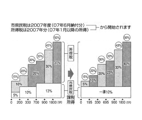 国と地方の税財源に関わる「三位一体の改革」の一環として、所得税(国税)から個人住民税(地方税)へ、税金が移し替えられること。具体的には、これまで10、20、30、37%となっていた所得税率を2007年分(1月)から5、10、20、23、33、40%に変更。現行5、10、13%となっている住民税率を07年度分(6月)から1律10%に変更します(図3)。
