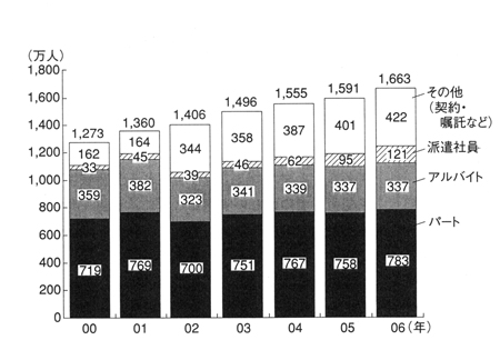 非正規で働く労働者は毎年増大しており(図1)、青年や女性では2人に1人が非正規という不安定な雇用と劣悪な労働条件に置かれています。