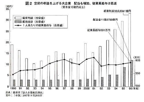| 図2.空前の利益を上げる大企業 配当も増加、従業員給与は低迷 |