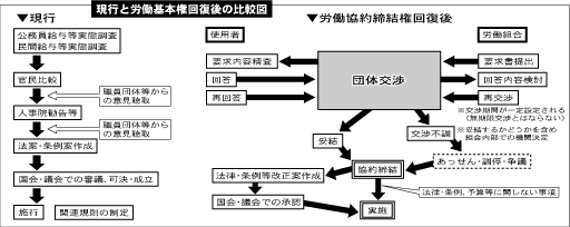 (3)団体協約締結権が回復された場合、給与は勤務条件法定主義や財政民主主義のもとに置かれるため一定の「指標」が求められる。その際、同種・同格原則に基づいて、単純な民間給与の平均ではなく、給与決定要素である職種、役職段階、勤務地、年齢、学歴等が考慮される必要がある。