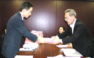 冒頭、盛永副委員長が4万8182筆の署名を浅野参事官に提出(写真)し、申し入れの趣旨を述べ、要旨以下のやりとりを行いました。(※別添の申し入れ書参照。国公労連側は○、行革推進本部事務局側は●)