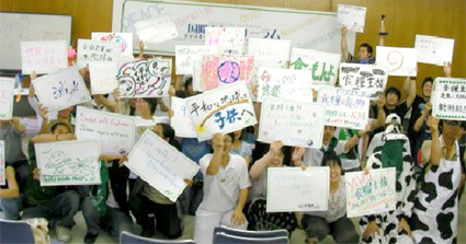 参加者は3つの班に分かれ海外代表とともに分散会討論を行いました。分散会討論では自らつくったプラカードを一人ひとりが説明し、G8サミット行動への思いを交流しました。海外代表から日本の参加者への質問などもあり、おおいに盛りあがったところでピースパレードに向かいました。