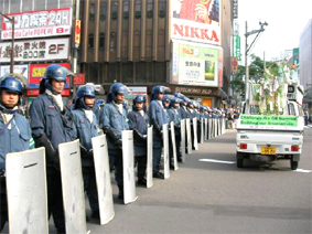 ※ここでちょっとパレードに参加した感想を。パレードにはものすごい数の警官や機動隊が配置されていて、交差点のところなんかは脇道にそらさせないように両側隙間なく機動隊が配備されていて、東京でもこうした経験をしたことがないのでビックリしました。今、税金の無駄遣いがいろいろいわれていますが、本当に必要な警備だったのか不思議です。あと、パレードでは逮捕者も出ましたが、私は逮捕現場の数10m後ろでいました。警察がわっと走っていき何が起きたのかな?と思っていましたがまさかパレードの参加者が逮捕されているとは。宣伝カーのサイドガラスも割られていて、東京でデモはやりなれていたつもりでしたが、ほんとビックリし、いろんな意味でビックリしたパレードでしたが、市民にいろいろアピールできてよかったと思います。(T.K談)