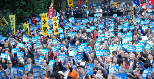 日本共産党の志位和夫委員長が連帯あいさつし、「麻生首相は国民の反乱に追いつめられ解散を引き伸ばしにしてきた。アメリカの金融危機で博打(ばくち)のつけを国民に回すな。内需拡大を求め国民と連帯し国民的大闘争を起こそう」とのべ、参加者を激励しました。