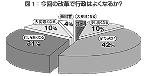 霞が関アンケート調査結果では、今すすめられている公務員制度改革が国民にとって「大変良くなる」、「少しは良くなる」を合わせてもわずか13%しかいません。国民のための改革とは思っていないことが伺えます(図1)。