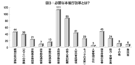 「本省庁や霞が関で必要な改革とは何か」の設問には、「長時間・過重労働、サービス残業の解消」に24%、「定員削減をやめて必要な人員の配置」に18%と回答率が高くなっています。自由記入欄には、厳しい職場の現状を浮き彫りするとともに、こうした異常な働き方を是正して欲しいという切実な願いが数多く寄せられています(図3)。