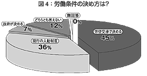 労働条件の決定方法については、「労働基本権を回復して労使交渉で決めるべき」は45%と一番多く、「使用者である政府が決めるべき」が7%、「現状の人事院勧告制度の維持」が36%となっています。現行制度を一定評価しつつも人事院への不満や、一方で労働組合への期待と不安も伺えます(図4)。