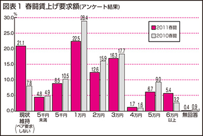 賃上げ要求額についてのアンケート結果は、グラフ(図表1)のとおり現状維持(ベア要求しない)が昨年の7・8%から21・1%と大幅に増えています。その影響もあり要求傾向値は図表2のとおり昨年に比べ低くなっています。要求額の決定にあたり重視してきた「3分の2ライン」は6、856円となりました。
