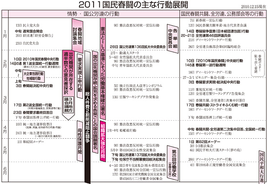 公務員も民間労働者も賃金が下がり、地域経済は消費不況で深刻です。政府は、通常国会での公務員の賃下げ法案提出を明言。こうした重大な権利侵害を官民共同で跳ね返す春闘の構築が求められます。2011年春闘は、菅民主党政権による「地域主権改革」や法人税減税、TPP(環太平洋経済協定)参加など大企業応援政治を許さず、4月の統一地方選挙とも結んで、広範な労働者・労働組合、業者や農民などとともにくらしと雇用を守るたたかいです。